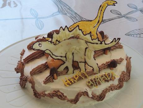 最新作 恐竜バースディケーキ、 直径25センチの大型ケーキですちょっとさわやか恐竜ですが ワーっという歓声が上がりました ☆ 恐竜の作り方まずオーブンペーパーに絵本から下絵を写しますチョコレートを湯煎して ビニールの絞り袋に入れ輪郭を描く次にホワイトチョコで中を塗りつぶします後は 黄色 黄緑のチョコペンで好きな色に絵を描きますペーパーごと平らなお皿に置き 冷蔵庫で冷やします恐竜は 前日に作っておきましょう 5月の教室のお知らせ5月14日 火曜日 11時から13時 参加費¥2000 今話題の「時短・簡単・エコ素敵なステンレスクッキング」 他のどれより早く 簡単な 経済的な料理を体験できますお料理が得意な方よりも むしろ面倒、苦手という方におすすメの教室です。レッスンの帰りには ちょっと気持ちが変わっているかも ご予約は クスパ へ