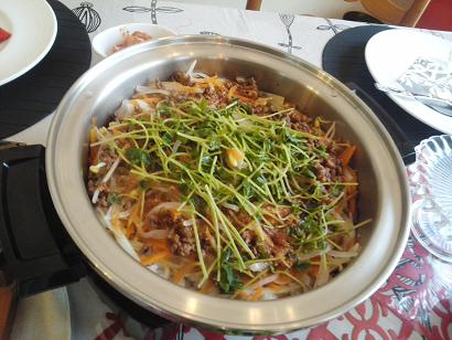 今日は 寒さが一段と厳しくなるとめざましで言ってました。このぶんでは今夜の夕食にも電気フライパンが登場するでしょう。献立の中にひとつ 温かいものがないとね。 そこで電気フライパンの活躍日記です。 おとといは、白菜をしきつめた上に菊花しゅうまい。昨夜はドカーンと 石焼きビビンパを作りました。この電気フライパンは ステンレス5層鍋に 電気のコントローラーがついていて コンセントとつないで料理できます。 お鍋の熱伝導や 保温力はなまはんかではなくお鍋料理といっても よせ鍋などは お手の物いつもの料理をテーブルの上で出来るので我が家の鍋料理はどんなレシピでもできるんです。はたして今夜は なにを作りましょうか。