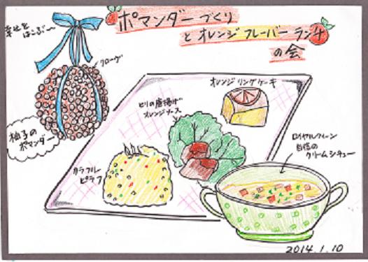1月 ポマンダー作り&オレンジの香りのランチポマンダーはかんきつ類に クローヴを刺して作る香り玉です。スパイスのクローヴには 防腐作用があり秋口には 腐らず乾いたポマンダーが見られます。 今回は大きい柚子に刺すことにしました。刺すときに周りに柚子の香りが満ちてダイエット効果があるのは小さなおまけですす。今日のレシピはオレンジにちなんだものを選びました。・オレンジソースをからめた 鶏のから揚げ・南瓜の入った ちょっとオレンジ色のクリームシチュー・オレンジの輪切りが 可愛いリングケーキ柚子の香りが漂うなかでの さわやかなランチになりました。
