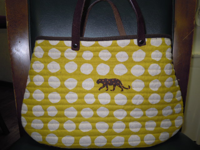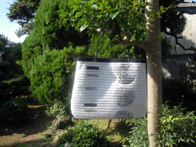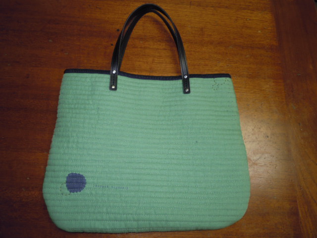 久しぶりにミシンキルトをしました。キルトは手縫いがと思ってミシンキルトはあまりすきではありませんでしたが・・・・・・博多・川端の丸十(布屋さんです)で素敵な幾何学的な柄?の布に両面接着剤付きキルト芯、裏布と合わせてミシンキルトしたバックが製作されて展示されてました。見たとたん一目惚れでした。早速、布を購入して作りました。・・・が即、お嫁入りしてしまいました。嬉しいような・・寂しいような・・頑張ってまた、作ろう~~。柄違い・色違いの形は同じバックをお披露目します。まだ、取っ手が出来上がっていない一目惚れのバック(口布はバックスキン皮使用)