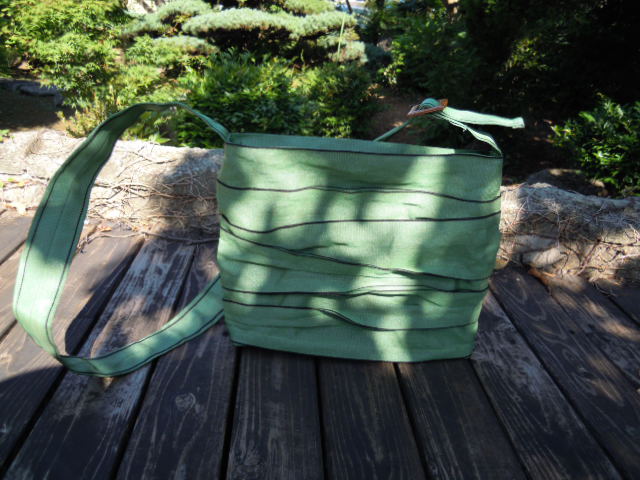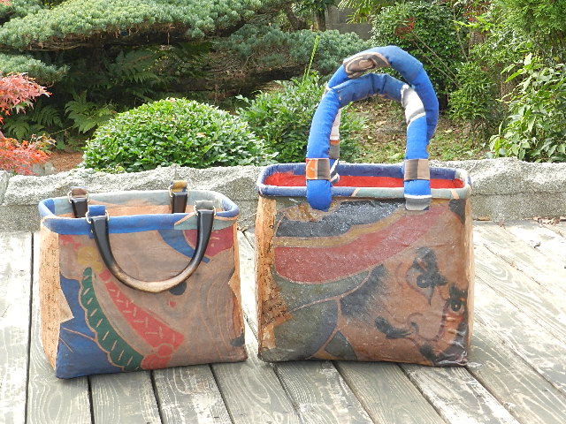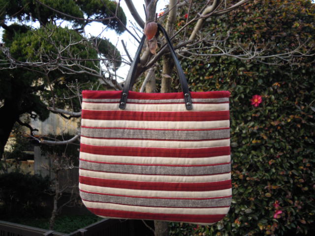 久しぶりに作品が完成しました。友人がカナダへ帰る前に完成させたかったのでホッ。何か目的があるとやっぱり頑張れるなぁ~と思いました。では、では、お披露目しま~す。赤いストライプ柄はミシンキルト・グリーンと黒の組み合わせは畳の縁と合皮で作ってみました。