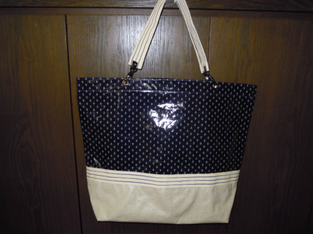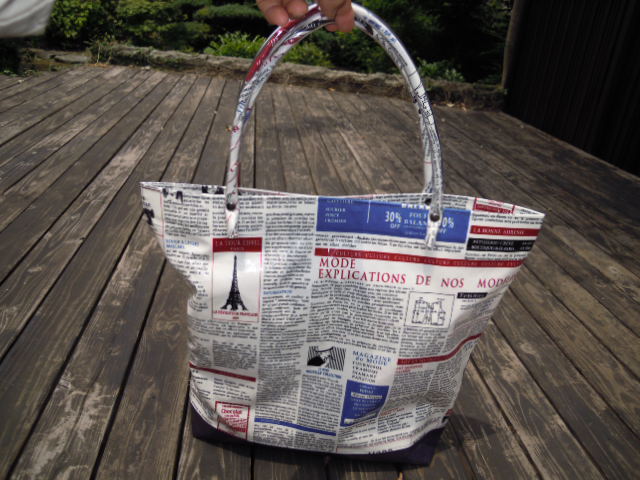 やっと出来上がりました。なかなか造るまでに時間がかかりましたが・・・造り始めたら3時間程で出来上がりました。(持ち手ラミネート布をホースの中へ入れる際てこずりましたがラミネート剤を使ったら楽々でした。)大好きなフランス語?柄のラミネート布です。使用した布・本体50cm(内ポケット・持ち手含む) 底布(デニムラミネート)20cm内ポケット・20cmファスナー付持ち手用・透明のホース・直径約1cmカシメ4組マグネット1個ソーイング用・シリコン剤底板透明のホースを取っ手に使用しているので使用感がソフトでなかなかgoodです.(ホースの中へ本体ラミネート布で作った持ち手をねじりながら入れます。)底板は3cm幅に切り本体口部分に強化の為使用します。持ち手をホースの中へねじりながら入れる時にシリコン剤が無くては無理です。ラミネート布を縫う時もシリコン剤があればス~イス~イと縫えますよ。