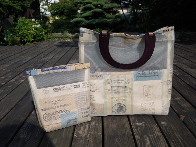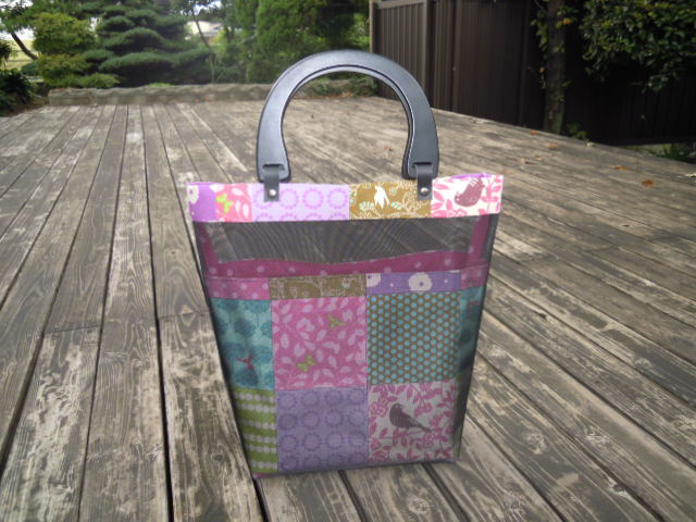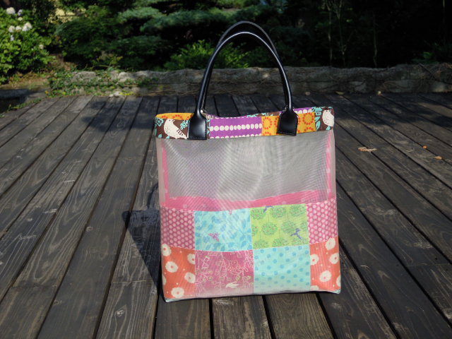 チュール(キルトパーティで購入)とechinoの布で春から夏に向けて涼しい感じのバックを作ってみました。チュールの透け感でechinoの鮮やかなグリーン系が落ち着いた感じになっています。内布にな二ヶ所にポケットが付いています。(一ヶ所には20cmのファスナー付)。バックの口にはマグネット付きです。お揃いでミニポーチもできました。ミニポーチはバックに入れたらechinoの布の高さでおさまります。持ち手を長い持ち手に変えれば斜め掛けにも出来ます。