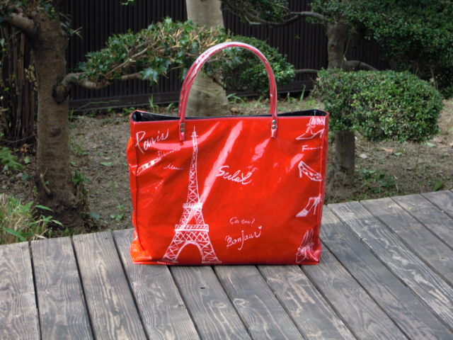 今回は、真っ赤なラミネート布でチョッと大きめのバックを作ってみました。裏布は薄めの合皮っぽい布です。「材料」表布・裏布共50cm・透明のホース直径1cm×1m・ファスナー20cm1本・カシメ8組・ソーイング用シリコン剤・縫い糸・底板2mm(底用)・底板1mm(本体口用)・マグネット・画像の色はオレンジ色っぽく写っていますが実物は鮮やかな真紅です。実物の色はホントに素敵な色ですよ。「サイズ」横40cm・縦34cm・マチ10cm・持ち手50cm。バックの口にはマグネット付き・内ポケットには20cmファスナー付です。チョッと大きめですが、縦長ではなく横幅が広い分、小柄な方が持たれても大丈夫です。共布で下着入れを作ったら一泊旅行でも良いかも・・・(作らなくっちゃ)。お嫁入りが決まったら共布の下着入れも持たせちゃいま~す。