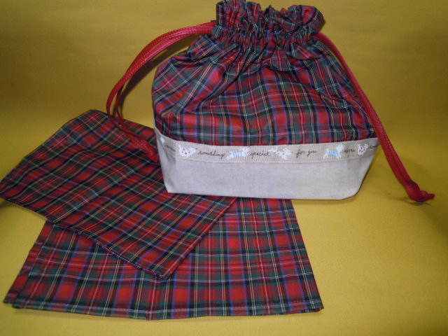お弁当入れサイズ、(横34cm・縦20cm・マチ14cm)チョッと大きめハンカチサイズ、(45cm×45cm)赤いタータンチェックは生成りのラミネート布と薄いツヤ無しのビニール布で出来ています。可愛い犬が印刷されたテープがアクセントになっています。底には底板を入れています。生成布にうさぎの柄と同じ柄のキルティング布のお弁当入れは可愛いピンク系で・・チョッと素敵と思いませんか最後に、まだお披露目していないバックの端切れ+ハートの刺繍入りが可愛い髪結びに変身しました。