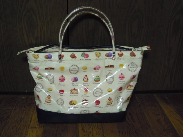友人がお孫さんの為に素敵なバックを(園用)作りました。凄~く素敵なのでお披露目しま~す。「マカロンなどスイートが沢山・・の可愛いラミネート布です。底にはデニムのラミネート布を使用しています。持ち手にはホースを使用しています。」本体の口には50cmのファスナーが付いているので中のものがこぼれ落ちることが無くとても便利だな~と思います。(凄い力作ですやっぱり孫の力は凄い)では~では~お披露目しま~す