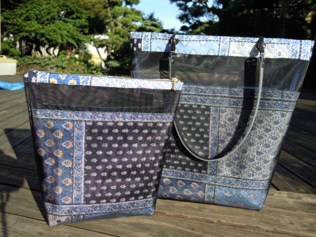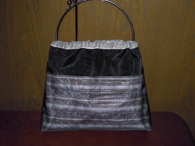 手芸店へ行き好みの布にめぐり合えたとき・・・ワクワクしてしまい購入してしまう手芸好きな人は結構、ついつい購入してしまう傾向があるみたいですね。我が家にも日に日に積まれつつある布たち・・・(^_^;)。それでも、今回は昨年から手に入れたかった麻のシックなボーダー柄(茶色+紺色)で透け感があり画像では本当の色合いが出ていないのが残念です。内布には麻(素敵な紫色)を使いました。画像ではブルー系に写っている感じですね。もう一つは・・・白地に幾何学的な柄の布に黒のハードチュールを張ってみました。持ち手は固定です。裏布は黒のサテン綿です。