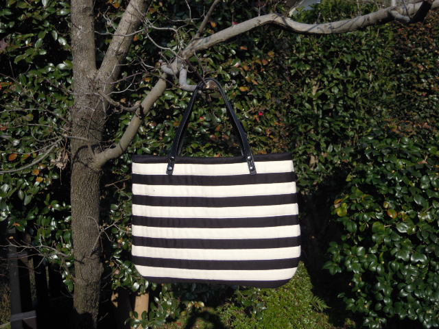 今回はチョッと大胆な黒と生成りのボーダー柄のバックを作ってみました。なかなか目を引くモダンな感じに出来上がりました。表面は「表布+両面接着キルト芯+裏布」ミシンキルトしてます。縫い代はバイアステープ(共布)で始末してます。内側に内ポケット二個(ファスナー付・スナップ付き)。裏布の山吹色っぽい色が今からの季節にgoodです。アッマグネットを付け忘れてました。