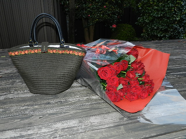 ウフフフ12/3は〇5歳の誕生日でした(^^♪(^^♪。今年の誕生日は真赤なバラの花束をサプライズでいただきました(*^。^*)夕食も予約を入れてくれて二人でチョッと遠出をしました。電車とバスを使っての久しぶりのデートでした。とても幸せなひと時でした。ハートがウフッ。この日に出来上がったバックもなかなか素敵な物が出来上がりました。バックと花束のお披露目です。バックはリバーシブルです。チロリアンテープはオレンジ色の鮮やかなバラの柄です。くるみボタンもチロリアンテープで作りました。裏布は英字柄です。くるみボタンも裏布でつくりました。