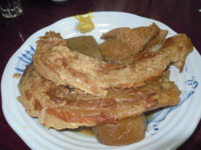 鹿児島へ週末一泊旅行へ行ってきました。息子(三男・大学生)と合流して息子がおススメの「軟骨煮込み」料理が美味しいお店へと案内してくれました。息子が案内してくれないときっと見つける事が出来ない所でした。場所は鹿児島市内・市電にて騎射場下車・徒歩5分・店の名前は「ゆうこ」という小料理?居酒屋?です。何といっても「軟骨煮込み」・とにかく軟骨煮込みの量に驚き・食べてみてあまりの美味しさに驚き・軟骨煮込みの下からおでんの大根・厚揚げ・コンニャク・ゆで卵が現れたのにも驚きです。一皿で3~4人分の量があります。「地鶏刺身」の量にも驚きですが最初の軟骨煮込みで驚きは和らぎます。「ナス味噌煮込み」も同じです。が・・・・・・「トマトソーススパゲッティー」には「軟骨煮込み」を超える量の多さに・・もう驚きを超えて大笑いしてしまう程です。是非とも、あの美味しい「軟骨煮込み」を食べにだけでも鹿児島へ出かけてみる価値はありますよと伝えたいのですが・・・くれぐれも一人では行かないように。4人以上でいくのが(せめて3人)ベストだと思います。画像には「軟骨煮込み」半分弱の量しか写っていません(食べた後の画像です。残念です。)「地鶏刺身」「ナス味噌煮込み」最後の「トマトソーススパゲッティー」の画像はです。