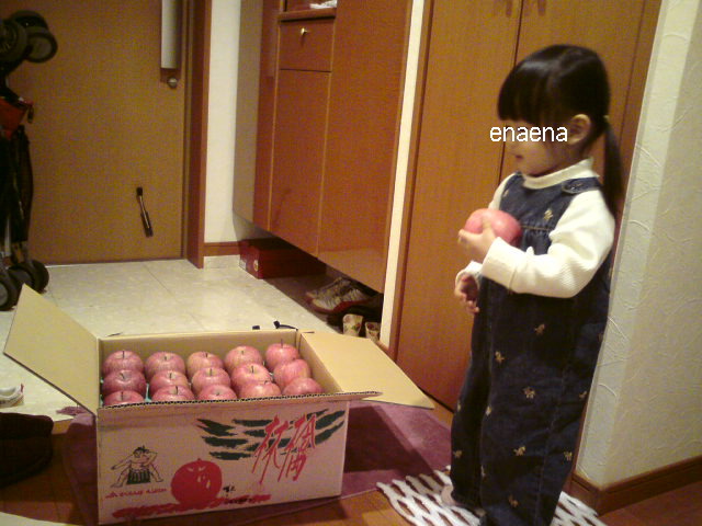 今日、1週間の闘病生活から娘が復活しました!!昨晩まで40℃を超える熱にうなされていた娘ですが、朝はすっかり平熱に戻っていました。まだ鼻水、咳は続いてますが熱が下がったことは本当に本当に嬉しいことでした。ずーっと溜め込んでいた家事を朝から片づけて、ほっと一息。ピンポーン♪玄関のチャイムが鳴りました(正確にはマンションなんでオートロックの玄関なんですが)モニターを見ると宅配のいつものおじちゃんが見えたので、キーを開けたんですが・・・。はて?何かたのんでいたかしら???ってぶつぶつ言っているうちにおじちゃん到着。重そうに抱えてきた荷物の正体は・・・りんご!!でした。ほ~~~~~、すっかり忘れていました。3月に携帯のポイントが期限切れになるので、ギフト交換をしていたんです。私がチョイスしたのは ふじりんご でした。シーズンになったらお届けしますってやつです。もう半年も前のことだったのです~~~~っかり忘れてしまっていて。中を開けるとりんごが綺麗に並んでいて、数えると20個。ん?下にも見えるぞ、赤いものが・・・お~~~、2段重ねでした!!!というわけで、40個のりんごが届きました。そしてすぐに思い出してしまいました。あ~~~~、私今日お買い物に行ってりんご5つ買ったんだ~~~!!!というわけで我が家には現在45個のりんごがあります。娘は大量のりんごにちょっと興奮気味でした。今日の娘のコーデはジンボリーのNBシリーズのポニーのオーバーオールと同じくジンボリーの白のタートルネック。18-24サイズ。オーバーオールは今年が着納めかな~。でもゆったりしていてとってもかわいいんです。そんなわけで、本日りんごを無駄買いしてしまった私です。こういうのが一番悔しいんですよね・・・・。今日から毎日りんご生活です。生で食べるのも限界がきそうなので、お菓子作ってみようかな~~~~。作ったことないけど・・・・。私の好きなりんごのお菓子です。これ作れたらいいのに~。フリーズドライの不思議な食感ソフトりんご(2枚入り)ふじ(限定) 【1117PUP5】