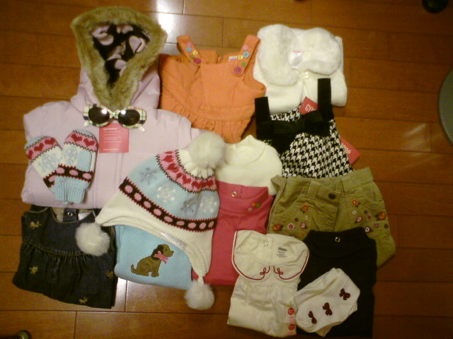 今回のCOFでオーダーしていた商品がやっとやっと到着しました!!11/6オーダー→11/7発送→11/14到着他の方よりちょっと遅かったみたいです。ですが無事に届きました。今回はお友達と一緒にオーダーしました。お友達分も合わせて$325のオーダー。送料ギリギリまでオーダーしてしまいました。そして気になる関税は・・・2300円でした!!うーん、思ったよりも高かった。やっぱりニット系が多かったから?まー、7%の消費税と思えば・・・。私が購入したのはこちら(携帯で撮影のため画像暗!)娘の冬服が本当に何も無かったので、がっつりたのみました。娘の身長は84cm、体重10.5kアウター、カーデは2T、他は全て18-24Mでぴったり?気になっていたニット帽のサイズはバッチリ!KGの3-4でピッタリでした。あちらの子は頭が小さいんですね~~~~。うちの子が大きいのかしら??ちょっとご機嫌ななめの娘はなかなか試着してくれないので、少しづつUPしていきたいな~。