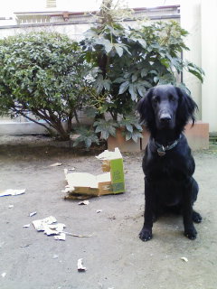 実は…ただ、段ボール箱とじゃれているだけなんですが。体が大きいと、猛獣に見えます。おばあちゃんに「こわーい」と、言われてます。実は…ただ、じゃれているだけなんですが…そして、、出来上がった げいじゅつさくひん と記念撮影。
