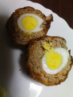 ←なんだこりゃぁ?(・_・;)肉だんごかい?ざーんねん!一応スコッチエッグです。暇なミニエナにいっぱいお手伝いしてもらって作りました。お味はまあまあかな。ミニエナは卵を茹でる。ミンチをこねる。丸めて衣をつける。盛り付けをする。の、4手順を担当。今回はカラリと揚げてみました。