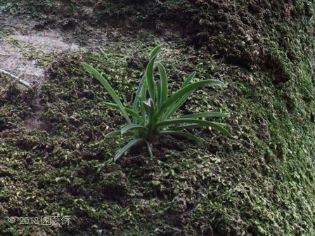 そこは樹齢の長く、幹にコケが生えた木が繁る森。どこかにフウランが着生していないかと探していたら、早速小さな個体を発見。逆光になるために撮影がしづらかったのだが、はっきりとフウランと分かる姿の撮影に成功。