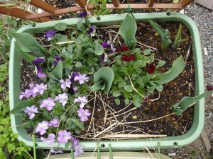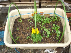 お昼寝からめざめたら雨が降っていました。そんなわけで本日のプランターの姿。ジャガイモ「インカのめざめ」は二つ目が発芽しておりました。黒マルチを持ち上げていましたので、破ってあげると白い芽が姿を現しました。若干の寒さか植が浅かったか、マリーゴールドは凍えてます。大根「ころ愛」は無事発芽。「つくし春」は本葉が伸びてきましたので、少し早いのですが、一本立ちに間引き。間引き菜はサラダの具の一部なのかな?午前中は日が出ていたのですから、午後から曇ってきてしまいました。エンドウは花をつけた後の変化もなく、茎色があせてきてしまいました。まあ植え替えたりしてましたから、致し方ないのですが、脇から何故か芽も出てきてますので、そのうち実を付けるでしょう。天気予報を調べるとちょっと早まったのか、月曜の朝また冷えるようで心配ではありますが、藁をどけるとチューリップはそこここに芽を出しています。エンドウプランターとチューリッププランターは園芸用タイで連結。これで倒れにくくはなったかと思います。