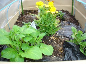 って画像はなし。上から見るとなんかすごいことになってます。もうそろそろ、ビニールはずさんと。インカも早くに芽を出したこは伸びてます。困った芽かきをせねば。さて、実験プランター。結果はなんか今見た感じは、堆肥が入ってないほうが元気いいかも。たまたまなんでしょうけど。 それよりも、ほうれん草に燐酸入れたのは失敗かも。細いのがひょろひょろ伸びてます。日照不足。たまねぎも勝手にひょろ長く伸びてますがこんなもんなのですかね?徒長?おまけの温室アップルミント。外に比べて勝手になんか伸びてます。本日はおやすみなさい。