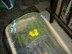 その日その日で処理をしていかないと、すぐ忘れてしまうもので。本日は、縛ってあった紐を外して湿気対策の換気をば。マリーゴールドオレンジは寒さに負けたのか縮こんでます。よーく見ていただけるとここにもジャガイモの芽が。黄色の丸が見えるかも。ジャガイモは順調。本日で4箇所発芽を確認しました。芽欠きっていつするんだ?あとで調べねば。大根はすこぶる順調。手前が「ころ愛」です。きっと見えませんが、マリーゴールドの間のタネまきも元気に一生懸命です。今週末は検査やらあちこち通院やらで園芸は減りそうです。整体も日曜に行かねばならんし。その他変化無しとしておきましょう。チョロミィさんに無理といわれた、葉っぱ系。農協で安かったので衝動買い。4月8日までに食べれるサイズにならないかな。本日の生活は以上。天気予報、最低気温5度以下なら、トンネルシートを縛る。明日は4度だからこれから縛ってきます。でも、昼間が外せないんだな。あっそうだで更新です。久しぶりの小田原城。桜開花していましたが、お堀がお花畑になっていたり、不思議な微妙な変化が・・・。携帯にて。ピンボケ。早いけど、おやすみなさい。