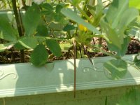 メンタル系ではなく一応園芸系。やる気がないと言いつつ、本日の作業。枝豆プランター整理。直植ミニトマト脇に引越し。ASAさんにはまったくかなわないけど、とりあえず虫除け作りましたよ。どうも、メンタル系のせいか計ってるんだけどぴったり作れない?なにがどう狂っているのか自分自身で判断が??? 昨日、コールラビを抜いて、マリーゴールドをそのまま混ぜ込んだ土に、大根の種を。昨日の絵でも今日の絵でも変化はありません。真ん中が、三浦大根。両脇は春にまいた「ころ愛」です。最終的に6本になる予定。落花生収穫後に、あと6本分三浦と、何か青首をまこうかと思ってます。青首系種余った方、6粒から12粒下さい。さて、本題の虫除けですが、昨日苗を買ってしまい、アブラナ科?ばかりでしたので、プランター整理して、スティックセニョール、カリフラワー2種、芽キャベツを2本ずつ移植。虫よけセット大をかぶせておしまい。真ん中に芽が出たジャガイモが埋まってます。 本日抜いた、脇芽トマトアンド昨日のコールラビもお引越し。 温室棚上段は小さなサイズばらばらプランターでしたので、あきらめつつ、木枠を作って、こちらも虫よけセットをかぶせて終了。 写真手前のハンガーは二つあって、昨日かな今日かな?ビオラをまきました。本日のところはここまでですが、気分がいいときにもう少し何か考えよう。さて、なにがどこまで育ってくれるかな?にしても、自分自身意外とやっています。とりあえずはえらいえらい。