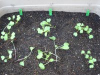 どうも期待してくださっている方々もいらっしゃるようなので。一応猫庭プランターご報告。本当は、ミニ臼とかマリネとピクルスの違いにコメントが欲しい我侭なやつでした。あとまき大根、虫に食われることもなく元気に本葉が出てきました。何の手入れもしてないのに、結構いい加減なやつなんですね。べたがけももうまもなくですね。プランターももうすぐ一杯ですね。間引きももうすぐ。一方、白菜は勝手にみどりに育っています。もう少し育ってくれたら、どこで見たのかお百姓さんみたいに外の葉を縛ってみたい。本日のおまけは、ワンダーランド、要はあまり苗避難所のにら、そのままなんですが、まだ元気っぽいです。この生命力は何だろう?すごい。あっ、出来の悪いむかご君は本日旅立っていきました。何本でも芽が出てくれたらいいな?その前に芋は本当に出来ているのだろうか?本日のところは以上。明日は、徒長徒長ブロッコリー、カリフラワーたちのご紹介予定です。おやすみなさい。