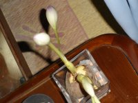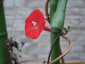 だめでした。昨日は気持ち色づきもうすぐ咲くかと思ったら徒長に負け、垂れてしまいました。 やはり秘密兵器に登場願い。どうなることか?実際はピンク色でそこそこきれいなんですよ。今判明した事実。左右に倒れることで、バランスを取っていたようです。治そうとして、気づきました。あとで、外に水遣りに行かねば。実を言うと、妙に首痛いんですよ。