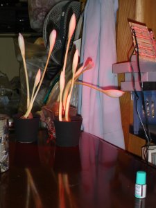 今日は面倒なので書かなかろうと思っていたのですが、昨日のコルチカムに家の中でLEDあてるのもなんかいじめのようでかわいそうなので、おもてに出すことにしました。 電照コルチカム君でした。これでいきなり開いてもショックはショックですけど、なんか見ていて痛ましくて。今までありがとうって感じで。背の高い徒長気味が家の中の子です。おまけは、大根。元気に育っています。今朝は会わなかったコパがうっさいなと言ってましたので、このあたりで。本日は以上。おやすみなさい。