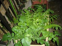 8月27日まき「ころ愛」を一本間引きました。ほかタネまき白菜も間引き。播種後秋なら40日ぐらいとのことで、日照不足猫庭から間引きです。直径4センチ、長さ12センチほど。シシトウもまだ取れてます。シシトウ今日は油いためかな?白菜、狭くなってきましたね。さて、皆さんからご指摘、ブロッコリーほか、いっこうに結実してくれないので間引き?して実家に里子に出しました。 実家は日当たりも良いので、いいのが出来るんだろうな。うちも数が減って栄養が周りやすいかもしれませんので、穴に腐葉土入れて頑張るよう伝えておきました。あしたはおでんとの情報を今もらいましたので、大根もう一本間引いてきます。たぶん、以上。