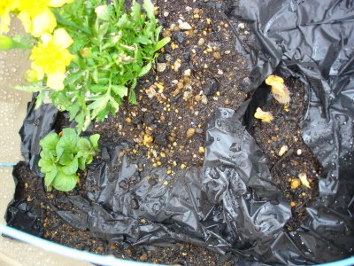 黒マルチを持ち上げていましたので、破ってあげると白い芽が姿を現しました。若干の寒さか植が浅かったか、マリーゴールドは凍えてます。
