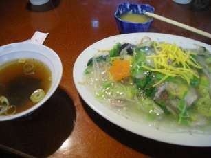 2013/03/16家内と車で眼科へ人間ドックで眼圧高めって言われて、視力もひどく落ちてる気がするので行ったのだが、眼圧も眼球自体も問題なしで、安心した。問題は視野。検査もいろいろして頂いて、視力も落ちてるので眼鏡の処方せんも出してもらった。ていねいに診ていただきました。ありがとうございました。左の下4分の1くらいの感度がかなり落ちてるらしい。やっぱり脳の出血のときのダメージじゃないかとのことでした。経過観察とゆーことでまた診て頂くことになりました。脳の出血でもっと見えなくなっちゃう人もいるし、おれはこの程度でラッキーだったのかもしれない。感度はものすごく悪いものの一応は見えているし..。脳の病気は思わぬ影響があるので怖いですね。某食堂で昼食。おれはあんかけ焼きそば。ここの焼きそばは人気メニューで噂はけっこう聞いていて、ようやく食べることができた。長野の正当派あんかけ焼きそば。美味しいとは思うが、おれは、うーん...期待が大きすぎたせいで個人的にはちょっと拍子抜け。夜は居酒屋としていい感じに使えそう。家内はランチのいかフライ定食家電量販店。新しいPCとスキャナを購入。仕事場に運ぶ。早速ネットの設定しようとしたがうまくいかず、翌日回しに。こーゆーのつらい。不得意でうまくいかずちょーいらいらする。夕刻、処方せん持って眼鏡屋さん。遠近両用なのでちょっと時間かかるし、お金もちょっとかかる。1週間後に取りにいくことになる。帰宅して夕食。根菜とベーコンのスパイス蒸し煮。我が家は蓮根と大根とベーコンのかわりにチャーシューで。これも「終電ごはん」のレシピ。旨い旨い。