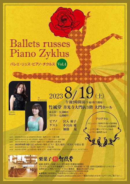 バレエ・リュス ピアノチクルスvol32023年8月19日 長野市竹風堂大門ホール14時開演みなさまぜひご来場下さいピアノ:宮入柚子、小宮山愛(連弾ゲスト)プロデュース&レクチャー:加藤 晃ドビュッシー:牧神の午後への前奏曲(ラヴェルによる連弾版)ストラヴィンスキー:蝶々(パピヨン)Op.2ストラヴィンスキー:謝肉祭(カルナヴァル)Op.9プレイガイド:ヒオキ楽器本店シャコンヌ、美鈴楽器ライフ店、 長野市芸術館チケットセンターお問い合わせ&チケットご予約:ピアノチクルス長野TEL: 070-6477-2702メールpianozyklusnagano@y-mobile.ne.jpピアノチクルス長野 HPhttps://pianozyklus-nagano.amebaownd.com/当日は生配信も行っております遠方の方、当日ご都合の悪い方はぜひこちらをご利用くださいアーカイブは2週間視聴可能ですhttps://twitcasting.tv/_a_kato/shopcart/239643