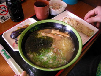 しおラーメン、ちくわの天ぷら、ゴボウサラダ、茄子の炒め物