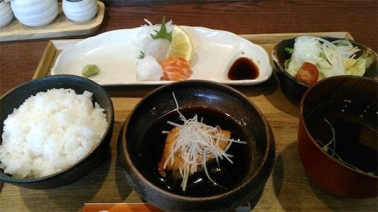 煮魚と刺身の定食。めっちゃ旨い。刺身も新鮮。