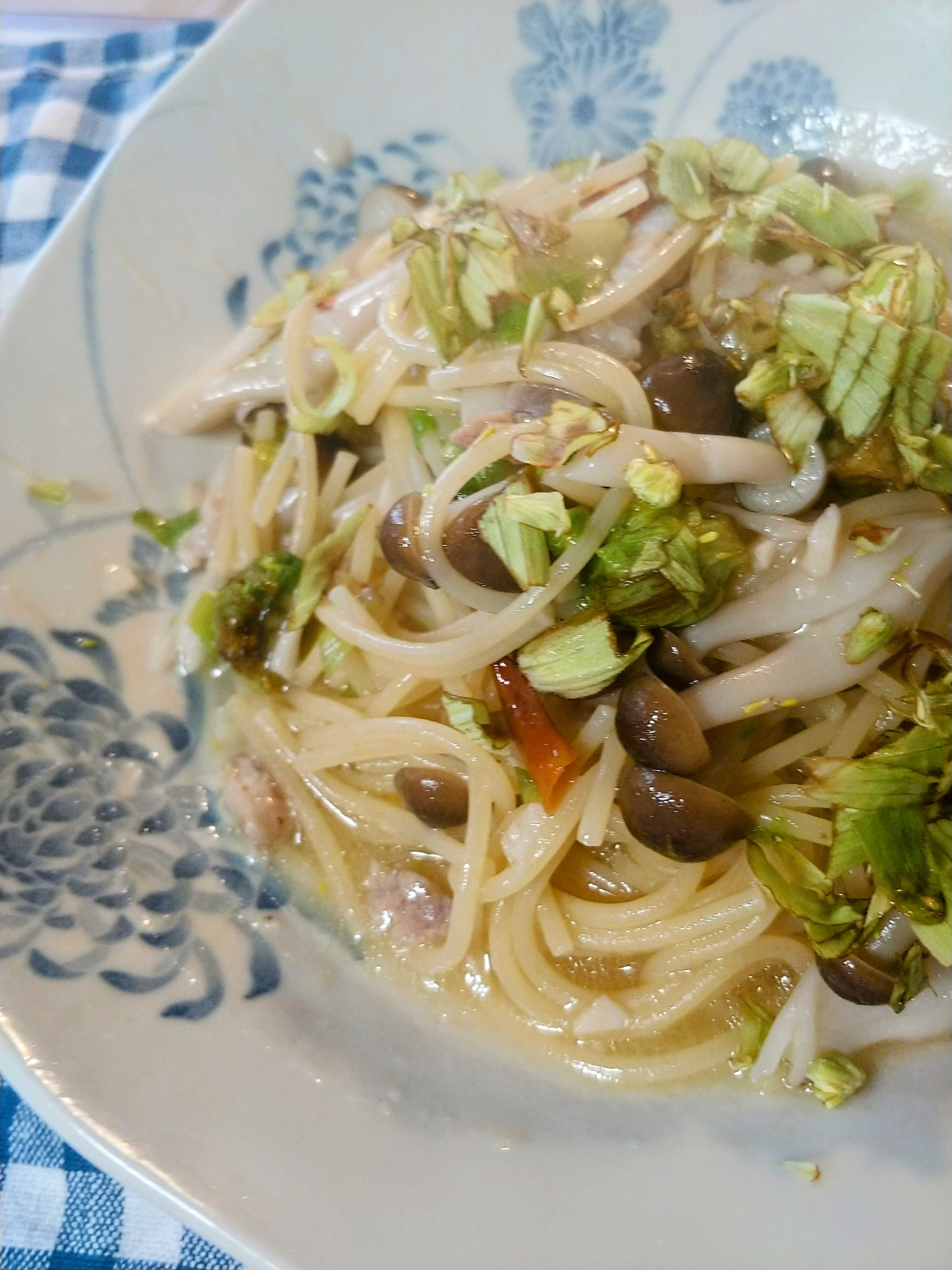 昼ふきのとうとしめじパスタ作って食う。うめー