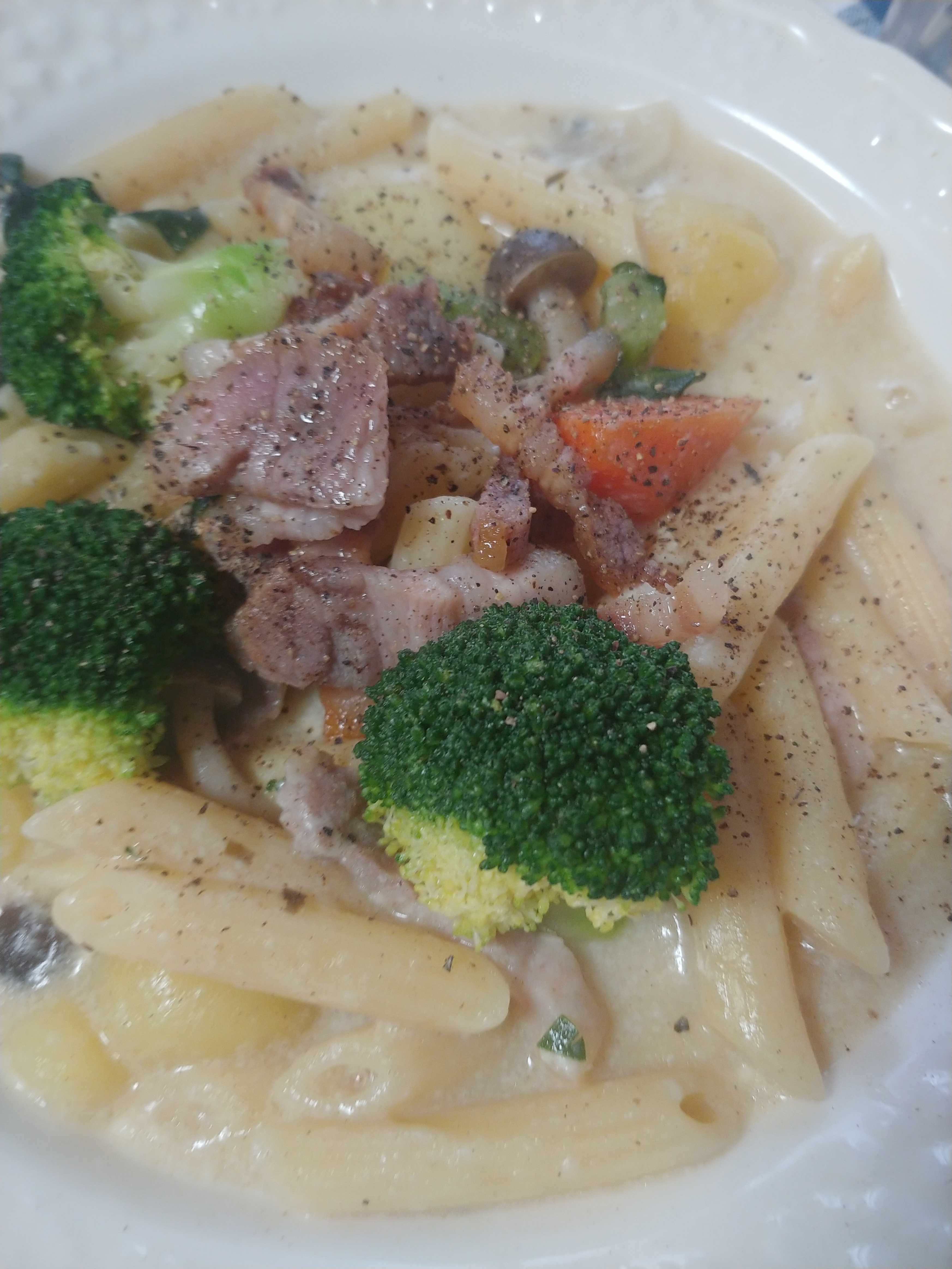 昼、シチューの残りでペンネつくる。自家製パンチェッタを使う。