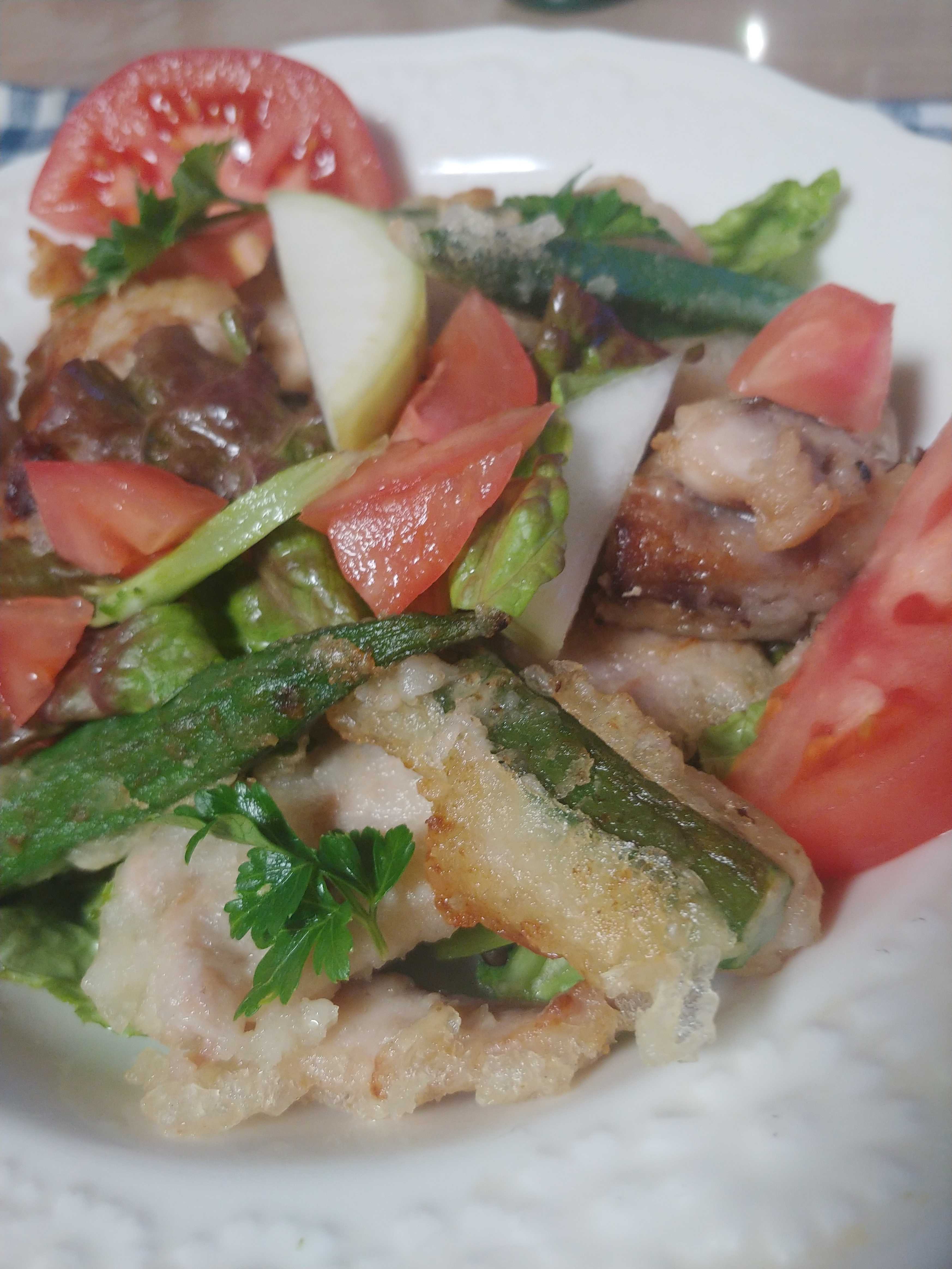 まぐろのアラでフリット作ってサラダつくる。うめー。こーゆーのはどんどん野菜喰えてよし。