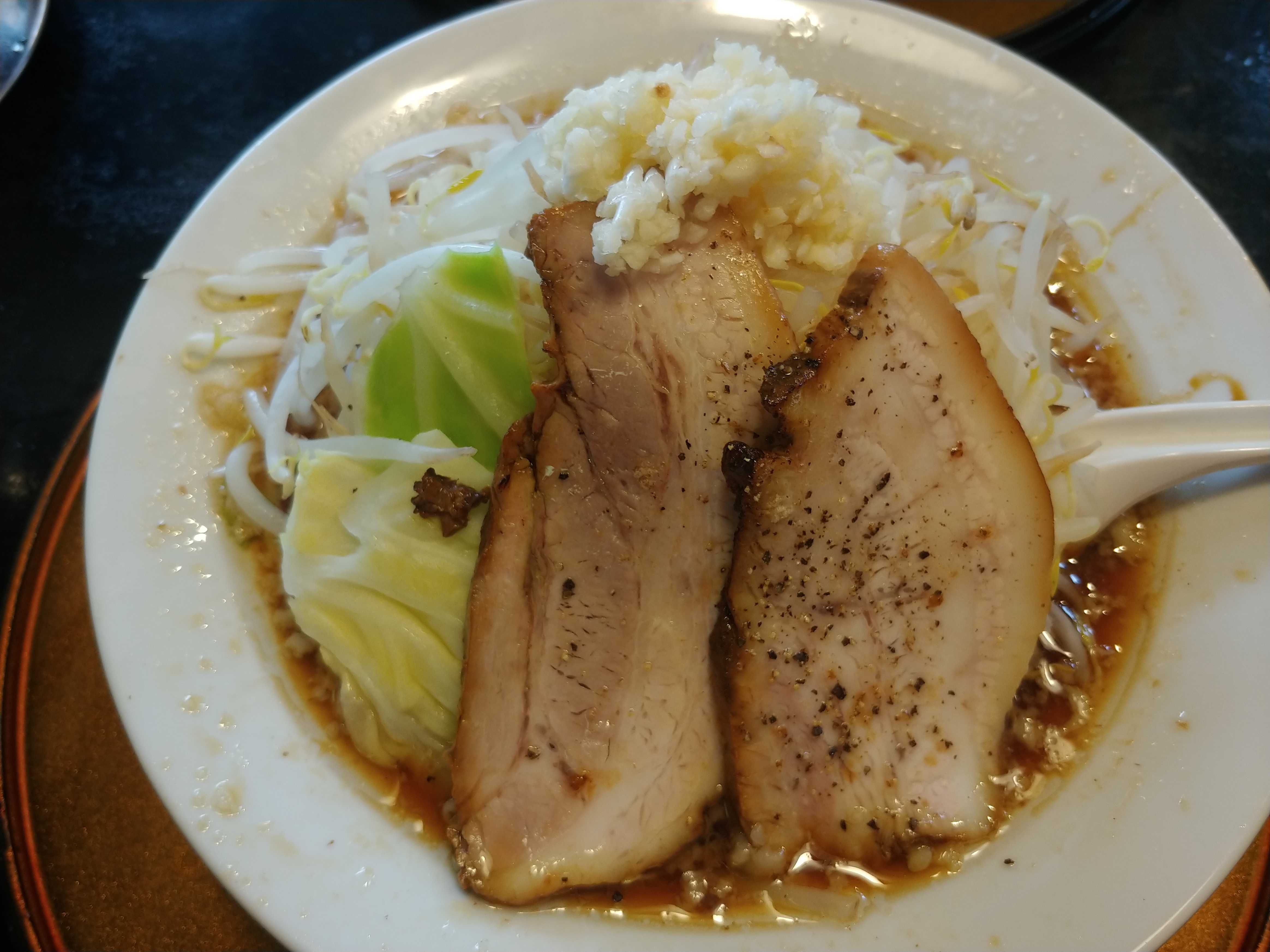 おれは岡村二郎。真上から撮ったのでたかさがわからないが、二郎系のラーメンなのでかなりもやしが積んである。