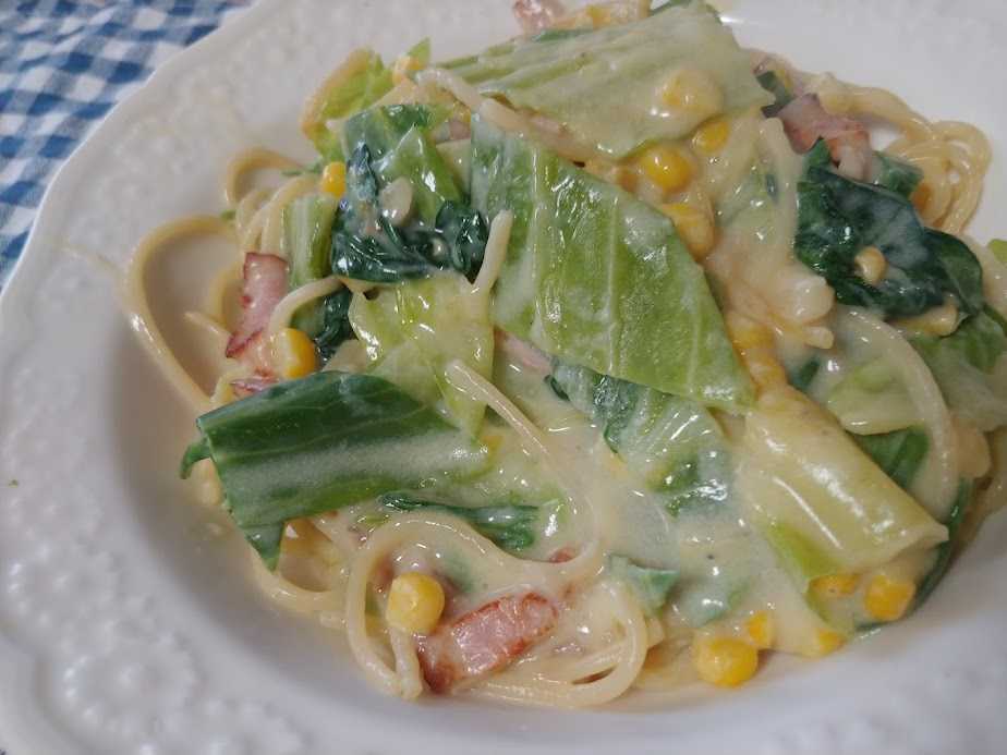 昼、キャベツほうれん草のクリー厶パスタ。