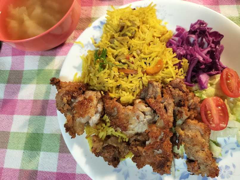 夕メシ、野菜ビリヤニの残りと、とんこまのひと口カツ