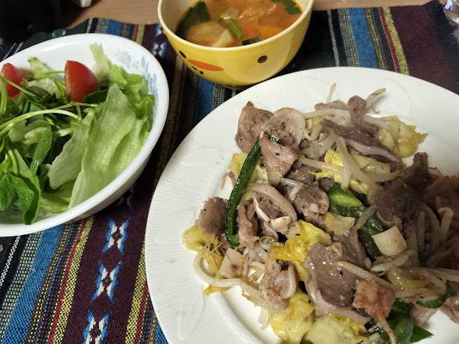 夕メシ。仙台土産のもつ炒めコリコリでうまい​