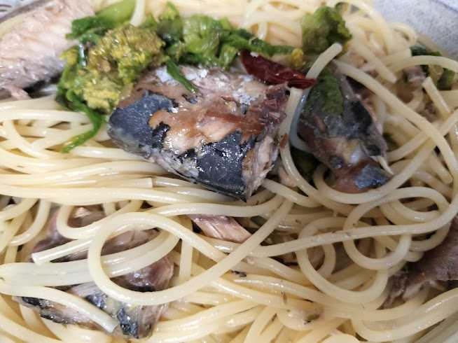 昼、ふきのとうオリーブオイル漬と鯖缶パスタ作る