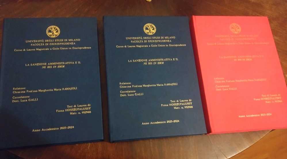 話は前後しますが、2月13日に大学近所のコピー屋さんに、頼んでおいた大学卒業論文の印刷本を取りに行きました。三冊印刷してもらいました。ラッキーだったのは、卒論の担当教授は、提出する論文は、コピーしたものでOK。一冊は、卒業兼試験時に提出するべきもの。よって公式なので紺色を選択。もう一冊は、もし印刷または、製本がうまく出来なかったためように、もう一冊が予備。+撮影用にもなるので、ピンク色を選択。撮影の時に、ピンクのパンプスやら、月桂冠をpink色系にしたので、ピンク色の卒論を製本しました。もう一冊が紺色。予備の予備。こちらが、両面印刷ページの卒業論文の製本し、少し薄めに出来上がってます。提出用と提出用予備は、片面しか論文が印刷されていないので、ちょっと分厚く仕上がります。結局、予想より少し高めに出来上がりました。まー、娘は喜んでいるので、良しとしましょう。例えば、理系の学部はこのような卒業論文はなかったり、学部によっても異なります。以前、届いた箱と月桂冠。配達の状況が悪いイタリアでもアマゾンが主流で、アマゾンで購入しまし、一週間前に届きました。コンフェッティと呼ばれえるお菓子を入れて、配るのですが、この箱選びにも大分苦戦しましたが、アマゾンで納得いく箱をなんとか見つけ、そこに、月桂冠の飾りをつけることで、可愛く仕上がり、満足しました。箱は、本の形をしていて、その上に大学卒業の🎓帽子がのっているものにしました。そこに寂しいので、月桂冠の飾りを付けました。↑完成。アマゾンで12個セットだったので、足りない分は、🎓帽子型の箱をばら売りで、コピー屋さんで購入しました。それでも足りない分は、赤い袋に入れて、月桂冠を付けることにしました。大抵は、赤い袋で終わらせます。今回、娘がこのようにしたいと言うので、尊重しました。