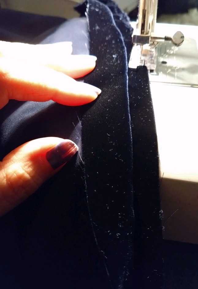 ベルベットは、とてもデリケートな生地で、過去に何度もダメにしています。今回は、失敗できない!ウール地やコットン時はマチバリのみで、ミシンがけをしてしまいますが、ベルベットでは、そんなことは出来ずに、仕付け縫いをしてから、ミシンにかけます。もはや何度も書いていますが、パンツは、内側から外側に縫います。前回は、内側を縫って、縫い代にジグザグ→アイロン→縫い代を開き今回は、外側に仕付け縫いをして、ミシンをかけて、縫い代→ジグザグぬいして→アイロンかけ↑股上のところで、右足と左足部分を合わせ、マチバリをつけます。マチバリを付けた部分を、仕付け縫いします。そして、ミシンがけ