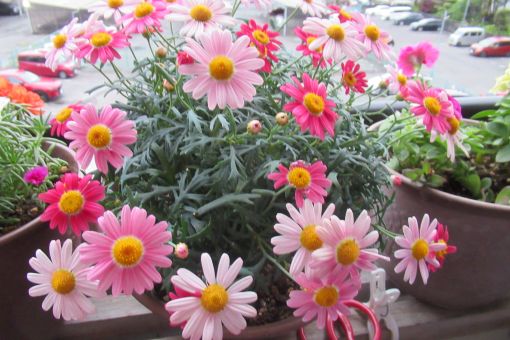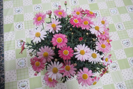 こんにちは。朝からどんより曇り空のお天気です、たまに太陽が顔をだしてくれます、雨が降らないだけマシか。。。ベランダに出ると花盛り、癒されます、トマトも三段目の花芽が見えてきました、昨年は四段で終わりにしたのでそこまでは頑張ってほしい。母の日にお嫁ちゃんから頂いたマーガレットが次々に花を咲かせています、白、ピンク、赤、花びらの先だけ赤い物もあります、4種類のマーガレットが植わっているのかと思っていたのです、ぷーさんが「この花1つだよ」私「うそぉ~~~」なんと1つでした、ビックリ白い花から薄いピンク、濃いピンク、赤い色と色変わりしていました、不思議です。昨日は買い物に行き、「暑くなったので何かサッパリした物が食べたいね」と冷やし中華にしました、息子は胡麻ダレで、ぷーさんと私は柚子ポン酢にマヨネーズで戴きました、美味しかったです。