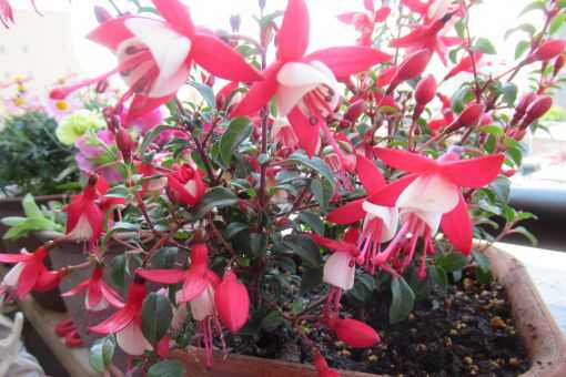 こんにちは。毎日曇り空です家の間取り北側の部屋とリビングを両方網戸にしたら風通りが良くて昨日、今日は寒いあまりに寒いので北側の部屋を閉めてちょうど良い、暑がりの私には過ごしやすい気温で有難いです、もちろん半袖です。フクシアです、この花もとても不思議な形の花です揺れるイヤリングのようにゆらゆらと揺れています。