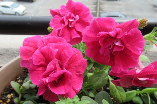 おはようございます。久しぶりに青空がどこまでも広がって爽やかです。ベランダに出て戻って来ないぷーさん、何しているのかと覗いたらパンジーの終わったのを片付けていました、ありがとう。畑をしていたときは終わった植物の土は畑に運んで使ったりしていましたが、今は終わった土を根っことかを綺麗に取って、土をほぐしたら厚めの黒いビニール袋に入れて太陽が半日当たる場所に置いています、再利用しています。八重咲ペチュニアです、白色がもうじき咲きそうです。