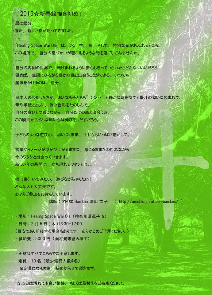 新しい年のイベントその2 は、ふーちゃんこと津山文子さんの恒例のアートワークです。立春の翌日2月5日、自分の内側に無限に広がる森と出会いましょう!お申込みは mami-miya★nifty.com(★は半角@にしてくださいね) まで初めて Wai Ola にお出での方には地図をお送りします。