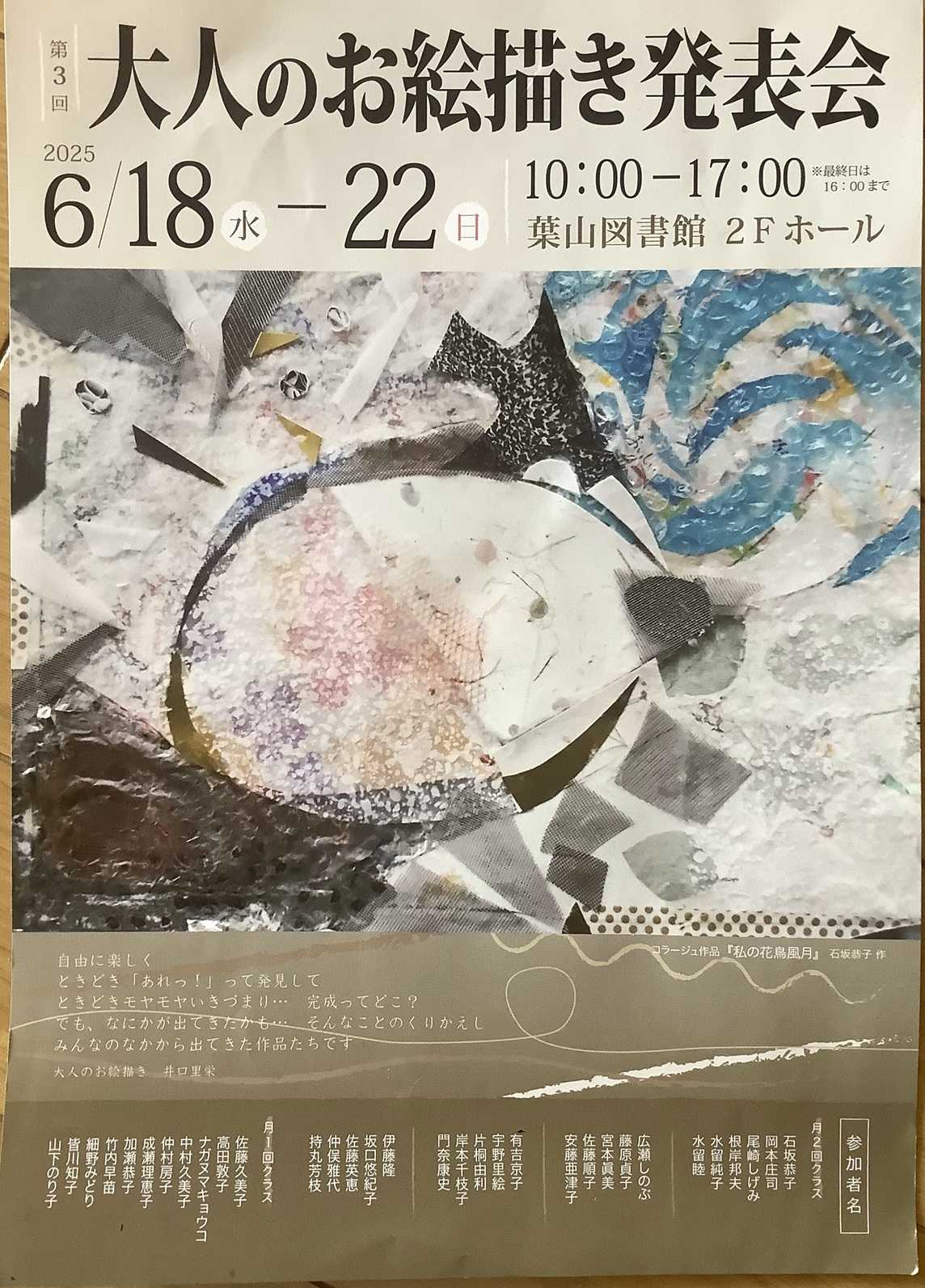 明日6月18日から22日まで葉山図書館ホールで、三回目の 「大人のお絵描き発表会」があります。坐禅仲間の井口里栄さんに「絵」を習い始めてもう4年になるでしょうか?「お絵描き」は愉しい!鉛筆、色鉛筆、クレヨン、コンテ、時には切り貼り、コラージュ、などなど。。。私は「花鳥風月」「東西南北」「曲のイメージ」「線のイメージ」など出品します。私の好きな「曲のイメージ」は大好きな Joanne Shenandoah のネイティブ・アメリカンの歌のイメージです。みなさんの素晴らしい渾身の作品たち、是非観に来てください。