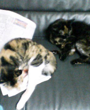 愛猫のまりながあちらの世界(どちらの世界?)に旅だって四十九日でした。可愛い猫を見ると思い出したり、、、、残されたモモコはどうもわがままというのか、ボケというのか、寂しがっているのか??よく鳴くようになり、朝は3時、4時、5時と目覚めて鳴いています。なぜかマリナに惹かれてしまう。。。。愛らしい顔と三毛のトラ模様がなつかしい。。。。やっぱり私は犬ではなく猫派なのかしら??ちょっとぼけてますが仲良く寝ていた頃です。