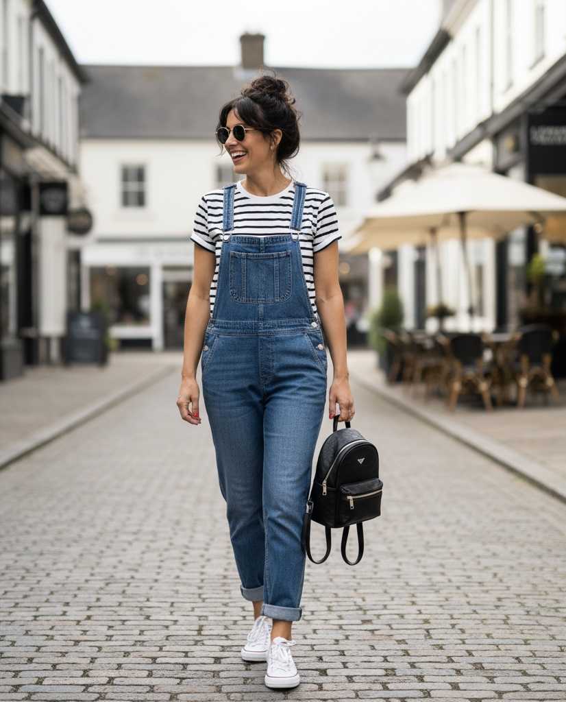 週末の街歩きに。オーバーオールで可愛くアクティブ! Tシャツを変えるだけで印象チェンジ簡単。