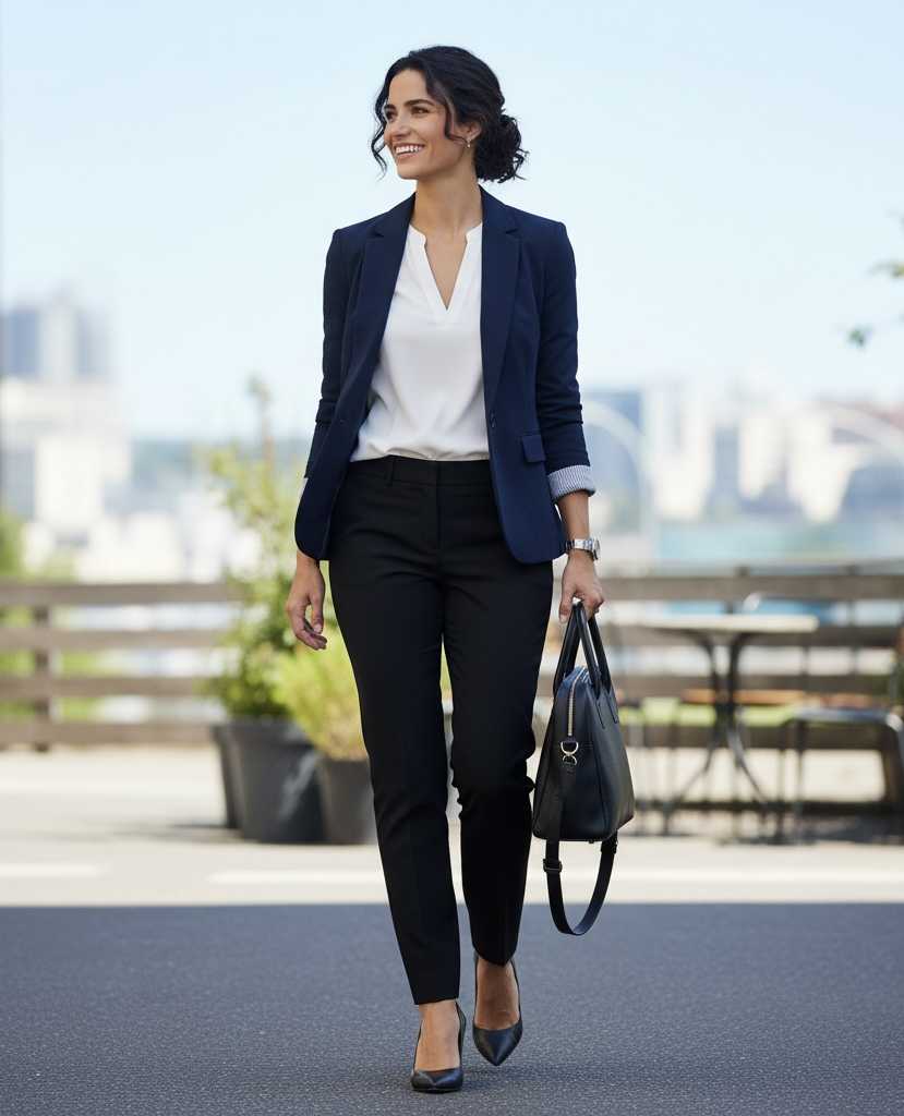 木曜のプレゼンに自信満々。ジャケットでキリッと決めつつ、ブラウスで柔らかさをプラス。パンツスタイルが脚長効果抜群!
